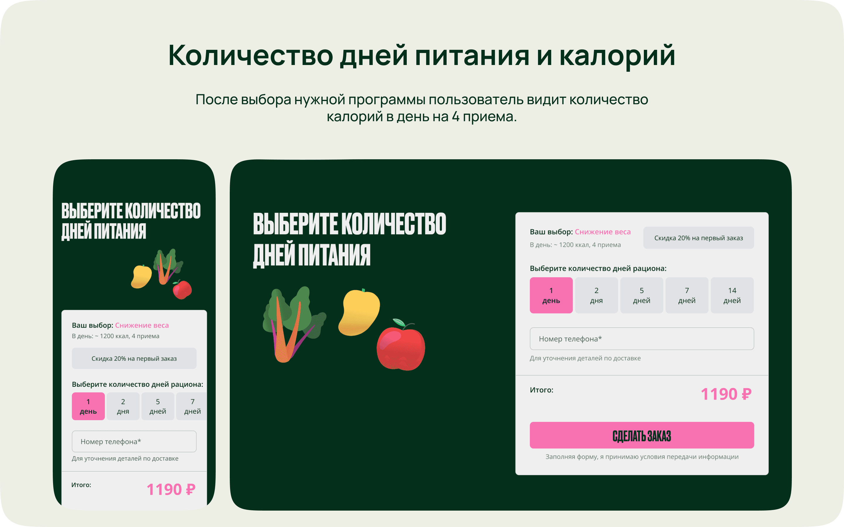 • Нет времени на готовку: в блоке “Выбор количества дней питания” пользователь сам выбирает, на какое количество дней заказать доставку.