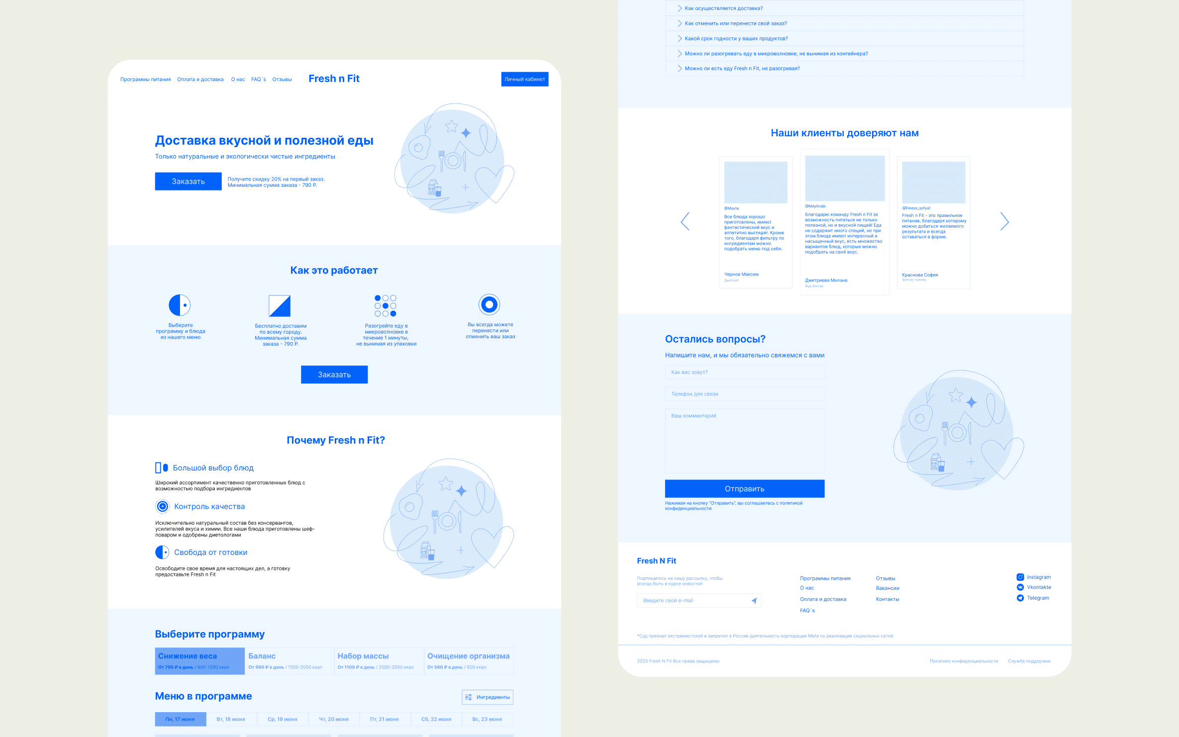 В этом проекте можно было подробее описать состав блюд и процентное соотношение КБЖУ для лучшего понимания. Подписку на регулярную доставку можно было сделать заметнее, а не только в футере - это важная функция для удержания клиента.