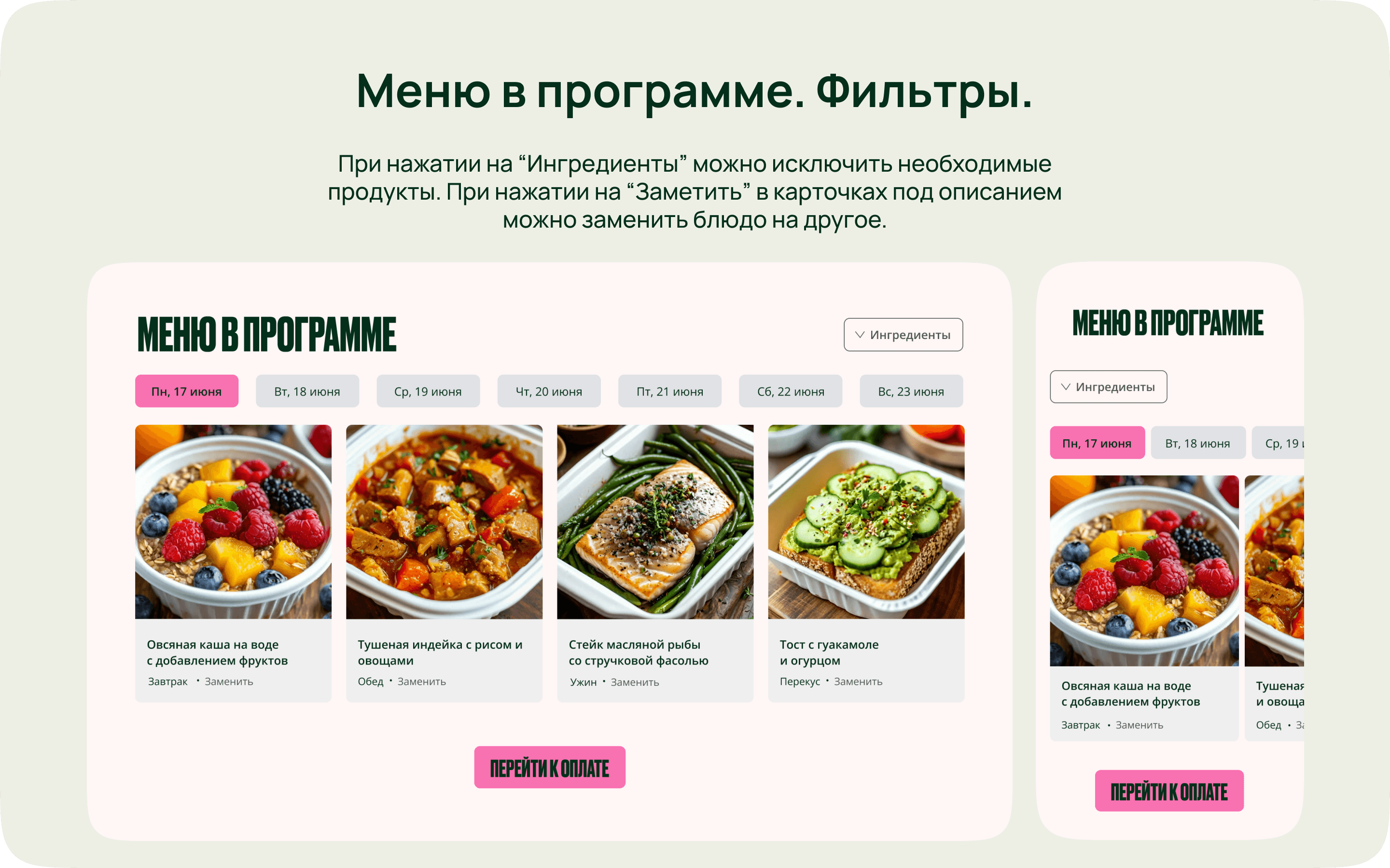 • Сложность выбора: внедрила фичу по замене блюд - кнопка “Заменить” дает возможность выбора из нескольких блюд. Фильтры позволяют исключать ненужные игредиенты, система подбирает варианты блюд без этих ингредиентов.