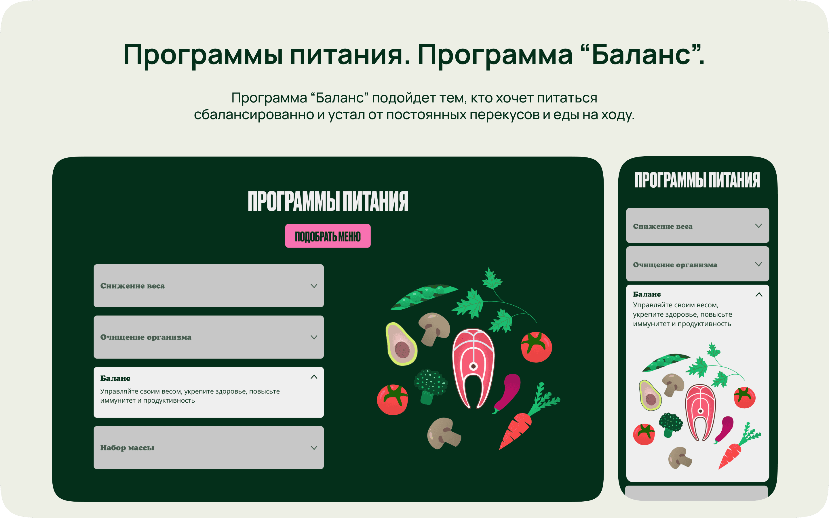 Проект появился как ответ на растущий интерес к ЗОЖ и потребность в понятных, доступных решениях для организации правильного рациона. Целью было сделать сайт современным и аппетитным, заслуживающим доверие пользователей.