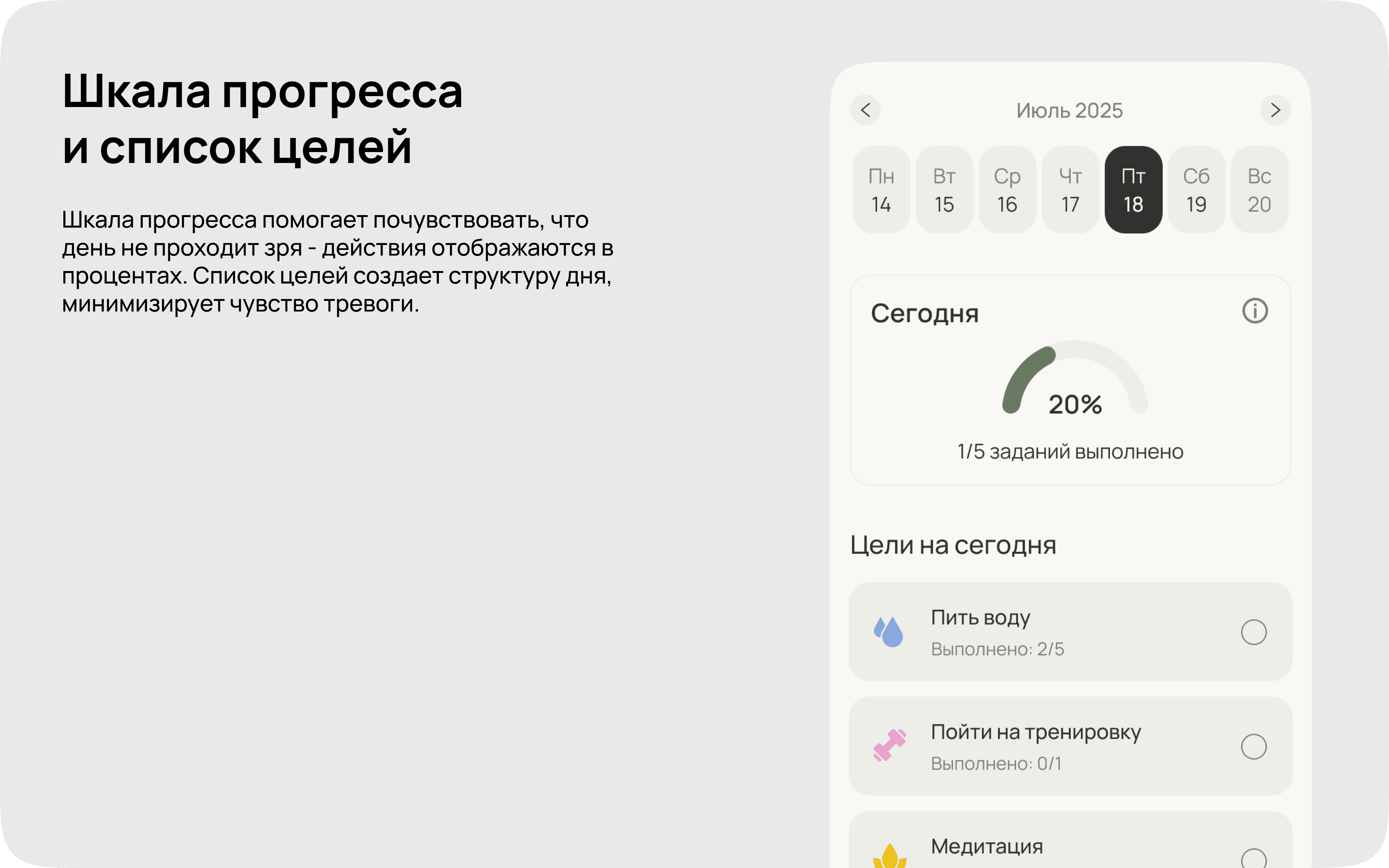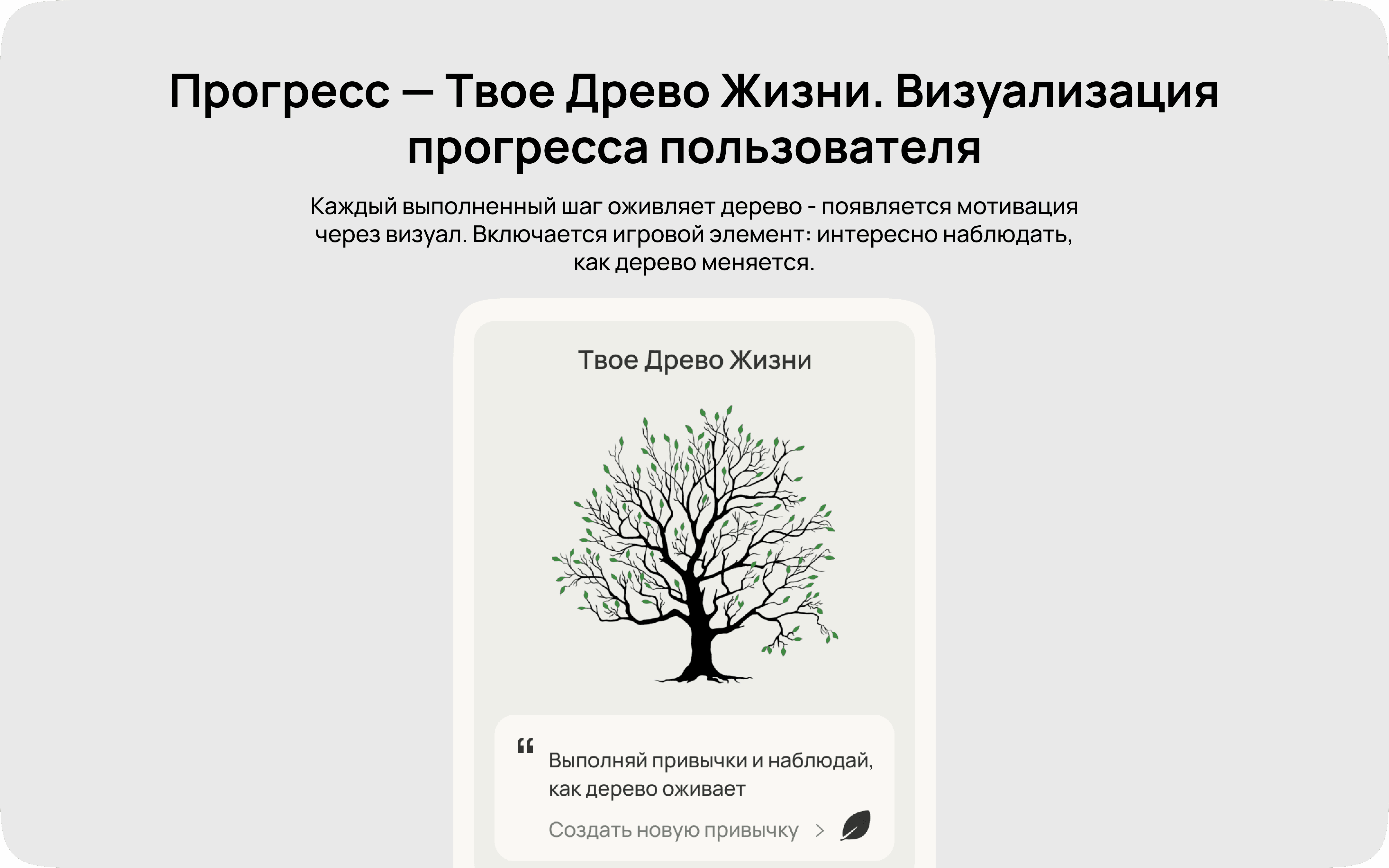• Отсутствие структуры дня: удаленщики, офисные работники, студенты часто имеют хаотичный день и нехватку времени. Список ежедневных целей и визуализация прогресса (шкала прогресса, растущее дерево, статистика) помогают отслеживать свой прогресс, появляется чувство контроля.