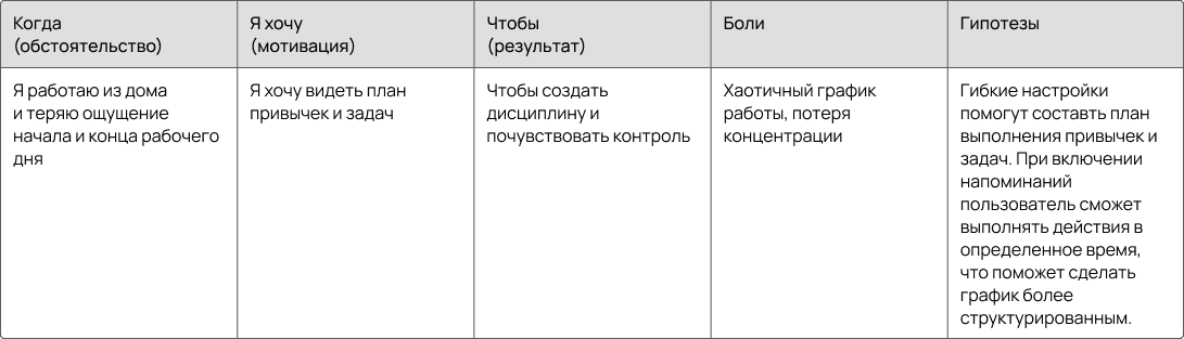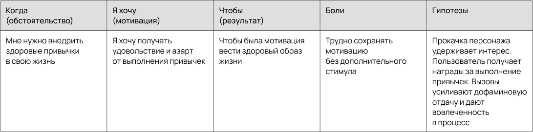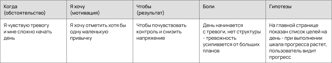 • Jobs To Be Done: определить сегменты аудитории, сформировать Job stories, выявить боли пользователей и сформировать гипотезы к ним