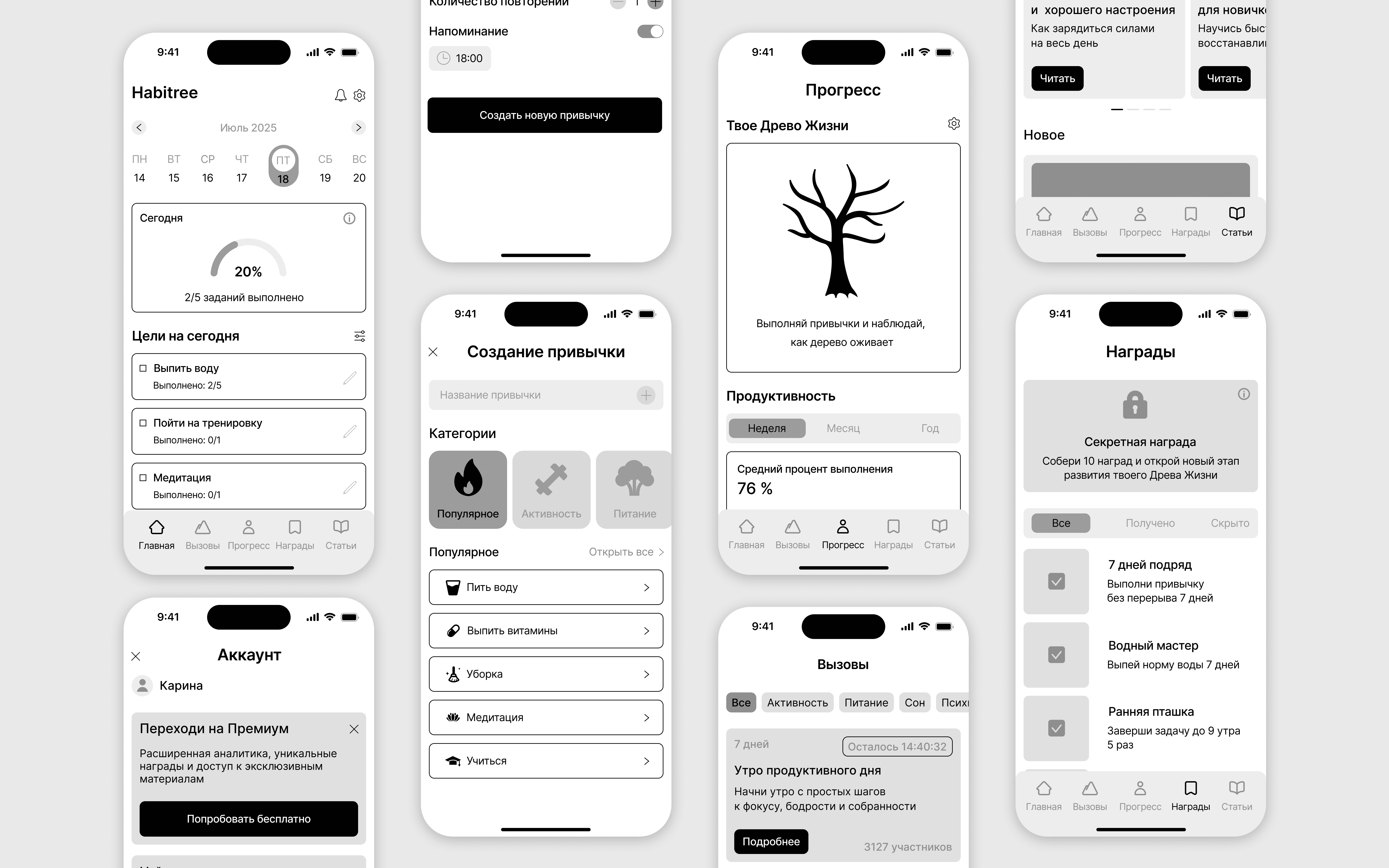 Передо мной стояла задача разработать дизайн мобильного приложения – трекер привычек для взрослой аудитории. Основная цель - помочь пользователям формировать полезные привычки и отслеживать прогресс, сохраняя при этом интерес к процессу.