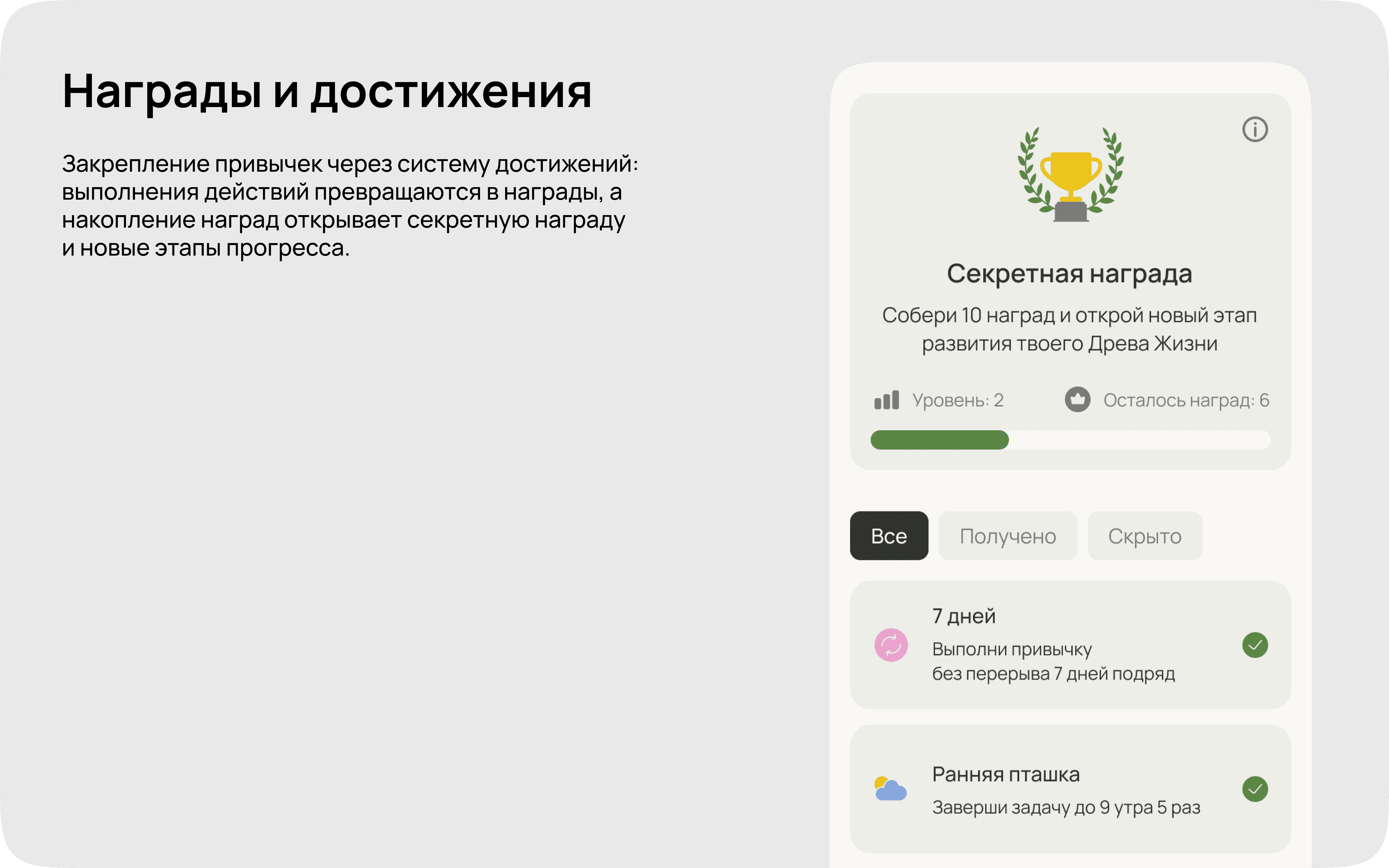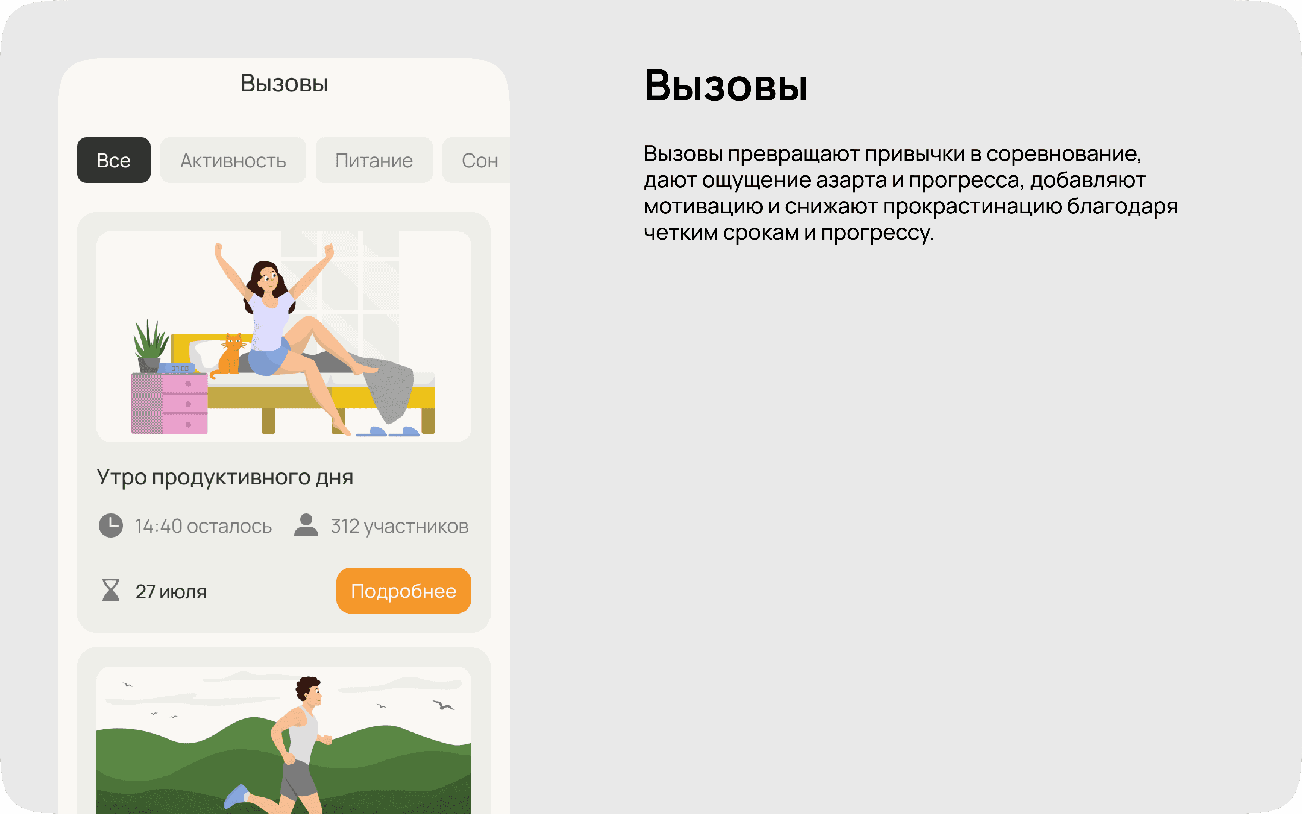 • Прокрастинация, потеря мотивации: есть вызовы с ограниченным сроком, игровые награды. Это дает дополнительную мотивацию и стимул пользоваться приложением, выполняя ежедневные привычки.