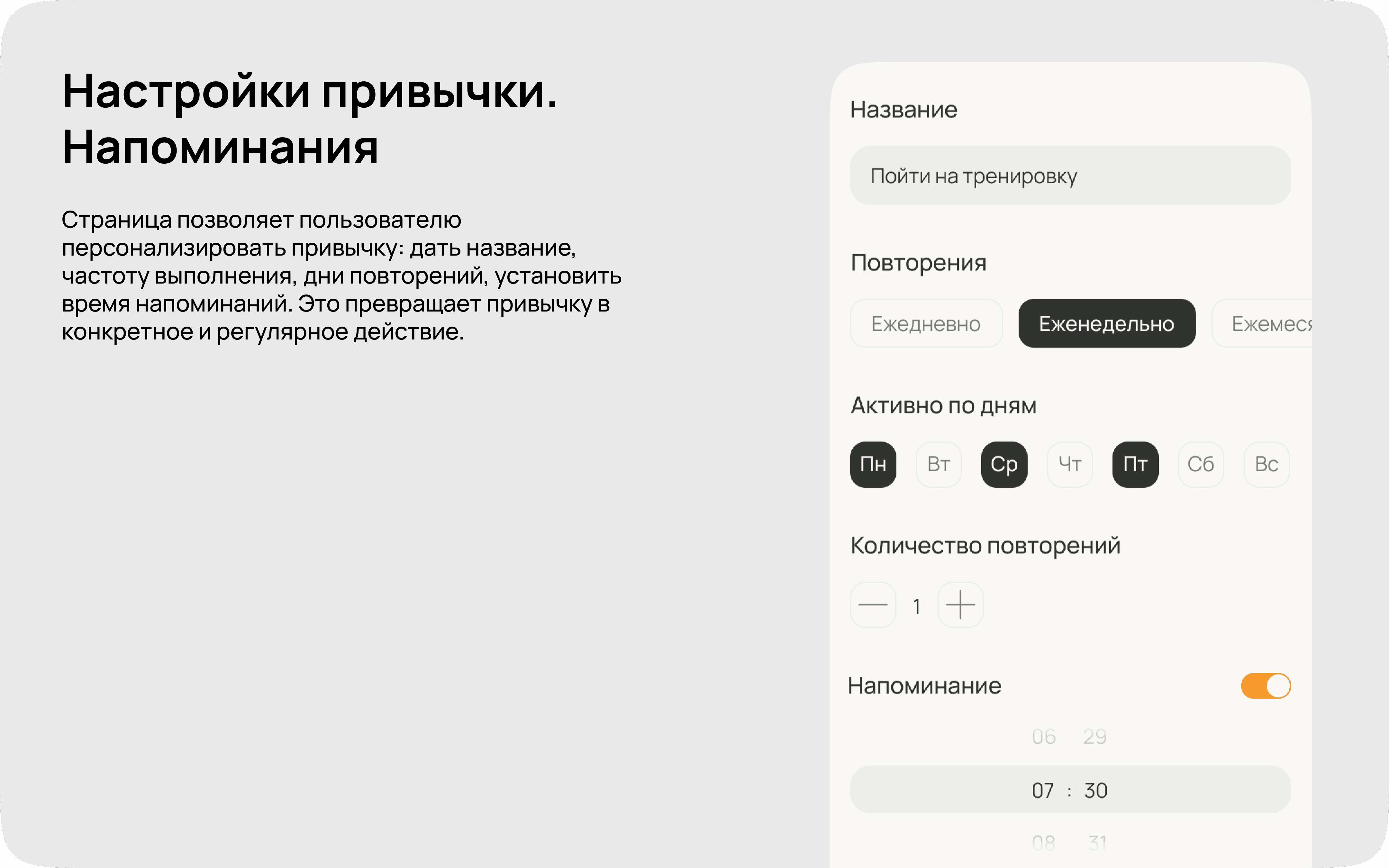 • Забывчивость, отвлеченность: гибкие настройки и напоминания помогают встроить привычки в свой день без усилий.